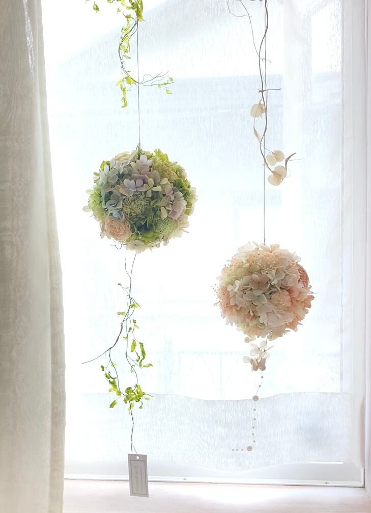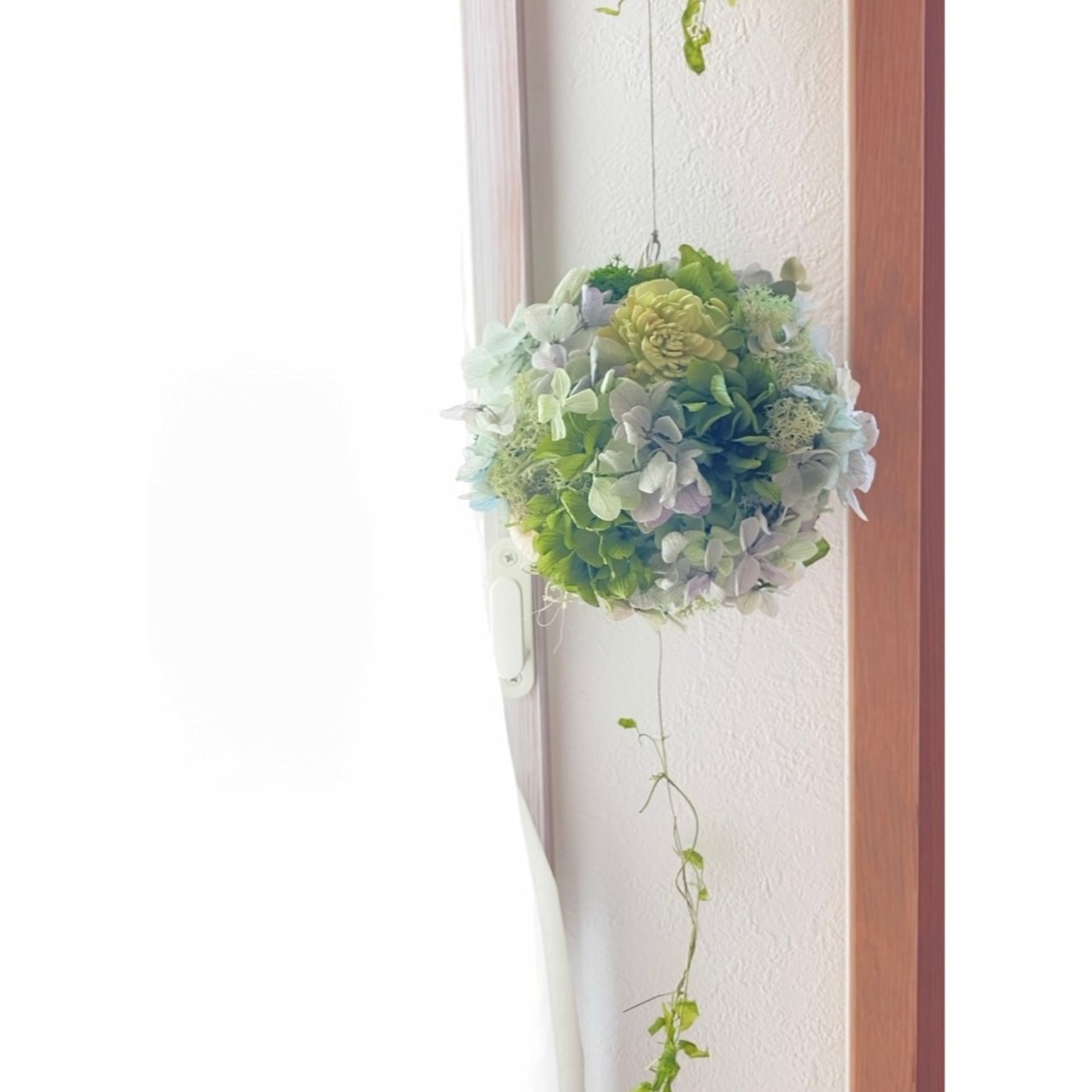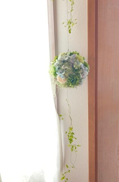 2種類のドライのモス(苔)とプリザーブドフラワーの紫陽花、ソーラーフラワーなど様々な花材を使ってナチュラルグリーンのフライングボールに仕上げました